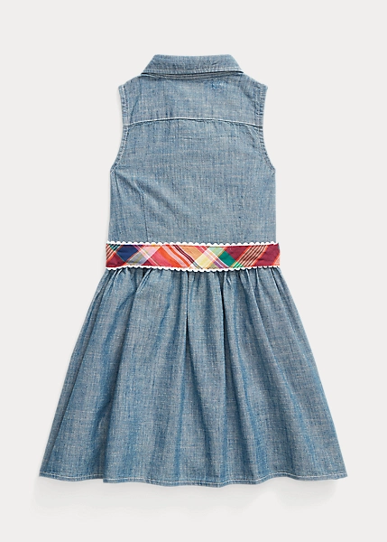 This shirtdress achieves a cute warm-weather look with indigo-dyed cotton chambray and a vibrant madras belt.
