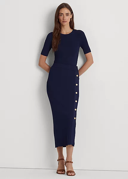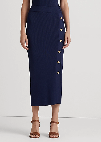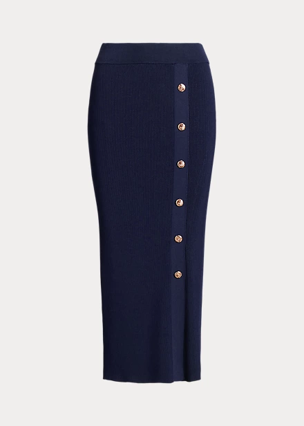 Signature crest-embossed buttons and a rib-knit pattern define the casual yet sophisticated allure of this midi skirt.