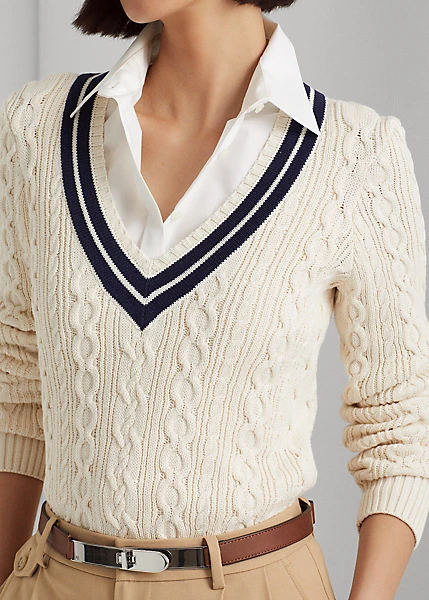 The season’s take on Ralph Lauren’s iconic cricket jumper, first introduced in 1972, is defined by a timeless cable-knit pattern and a striped V-neck. Accented with Lauren’s signature embroidered logo, it’s crafted with combed cotton for an unbelievably soft hand. Ralph Lauren partners with Better Cotton™ to improve cotton farming globally.