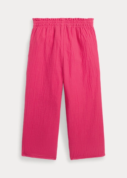 Breezy cotton fabric and crocheted trim on the hems amplify the warm-weather appeal of these trousers, which are washed for added softness. Ralph Lauren partners with Better Cottonâ„¢ to improve cotton farming globally. Better Cotton trains farmers to use water efficiently, care for the health of the soil and natural habitats, reduce use of the most harmful chemicals and implement the principles of decent work.