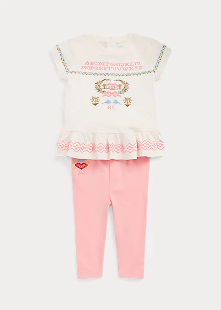 This set unites a cotton peplum top with comfortable stretch jersey leggings – both of which feature sweet signature embroidery. Ralph Lauren partners with Better Cotton™ to improve cotton farming globally. Better Cotton trains farmers to use water efficiently, care for the health of the soil and natural habitats, reduce use of the most harmful chemicals and implement the principles of decent work.