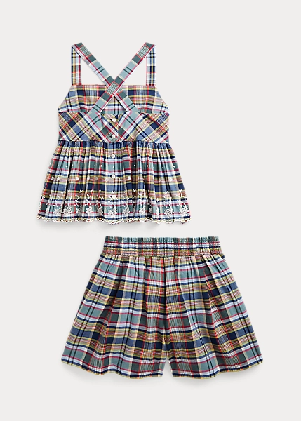 This warm-weather set includes an eyelet-embroidered top and smocked shorts – both of which are made with authentic cotton madras from India.