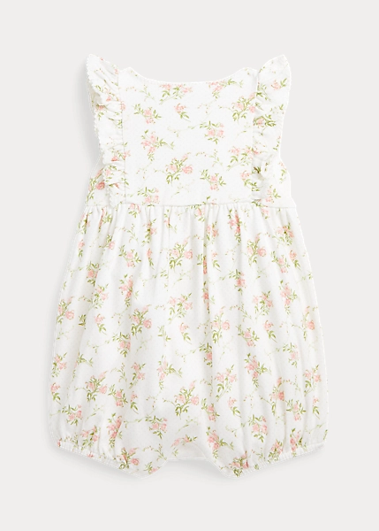 Made with ultra-soft cotton interlock, this one-piece charms with a floral print, flutter sleeves and delicate picot trim. Ralph Lauren partners with Better Cotton™ to improve cotton farming globally. Better Cotton trains farmers to use water efficiently, care for the health of the soil and natural habitats, reduce use of the most harmful chemicals and implement the principles of decent work.