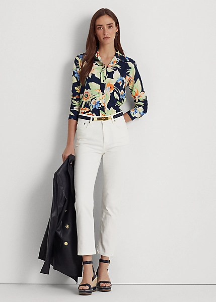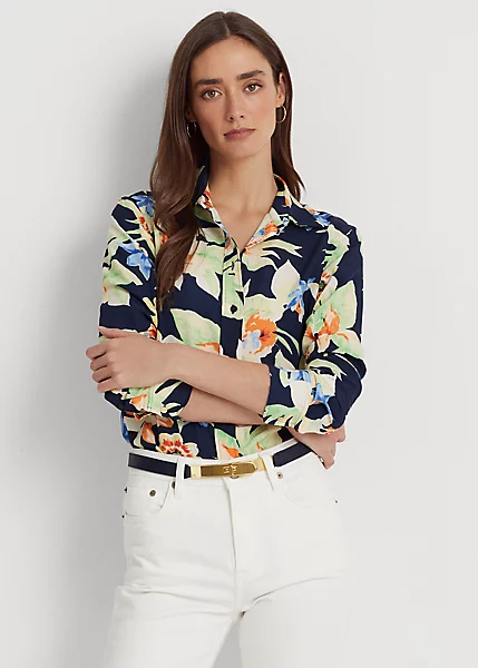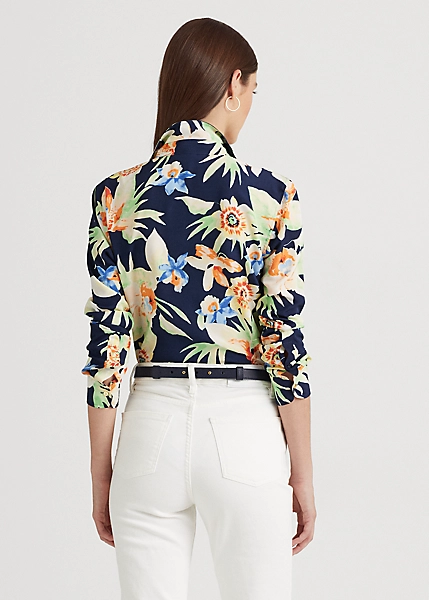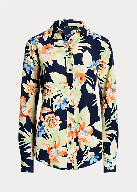 Embellished with signature engraved buttons, this lightweight crepe shirt is enlivened by the season’s tropical floral motif.