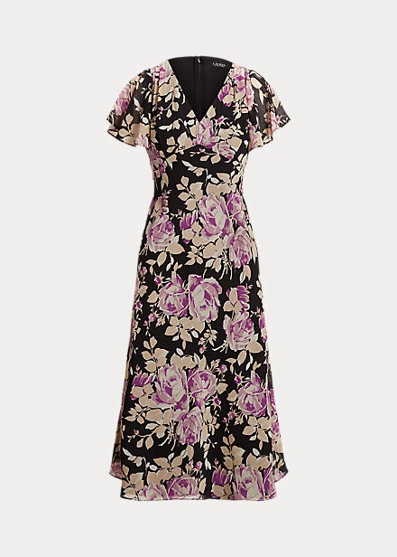 Exuding romance, this light-as-air georgette dress is characterised by an empire waist, flutter sleeves and the season’s floral motif.