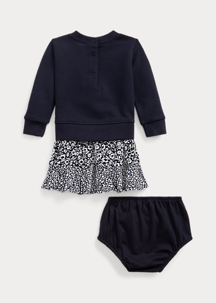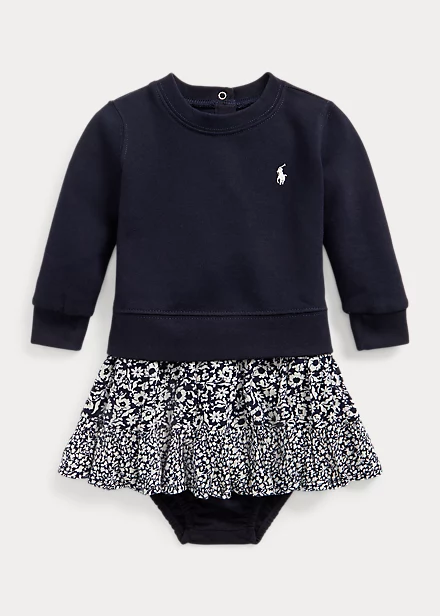 This cotton dress combines the comfort of a lightweight fleece sweatshirt with a woven floral skirt. Ralph Lauren partners with Better Cotton™ to improve cotton farming globally. Better Cotton trains farmers to use water efficiently, care for the health of the soil and natural habitats, reduce use of the most harmful chemicals and implement the principles of decent work.