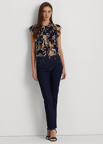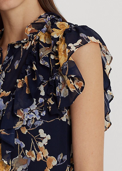 Effervescent ruffles and airy georgette bring a romantic sensibility to this shirt, which is cut for a contemporary sleeveless silhouette. The season’s floral motif enhances its feminine appeal.