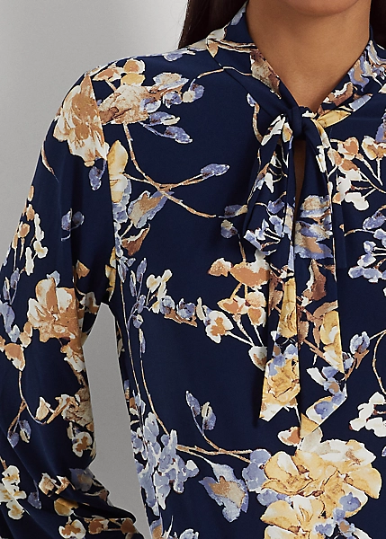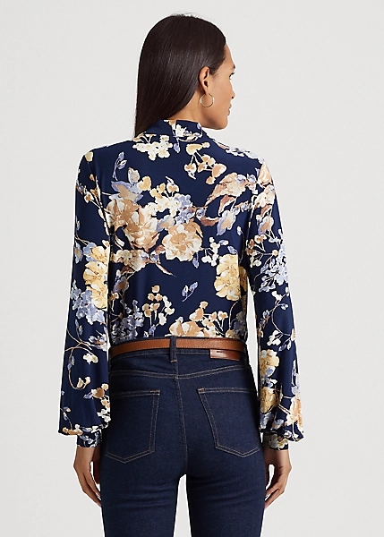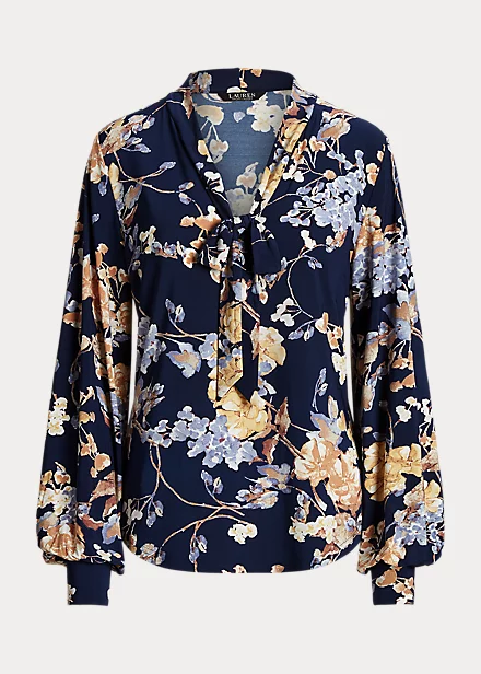 A self-tie accent on the neck and blouson sleeves bring a romantic sensibility to this breezy top, which is made with lightweight stretch jersey for a soft hand. It’s refreshed for the season with an elegant floral motif.