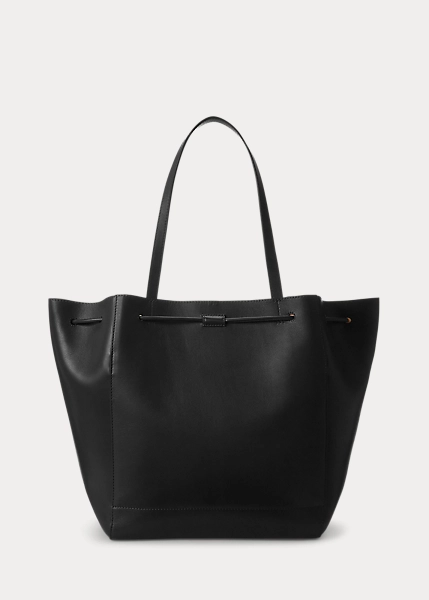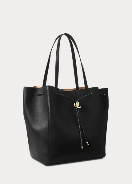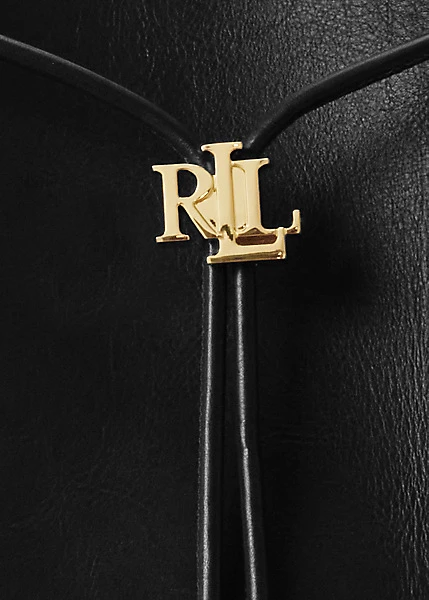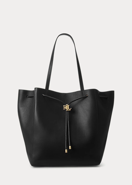 - Dog-clip closure. Drawstring cinches on the front with a polished “LRL” metal stopper.