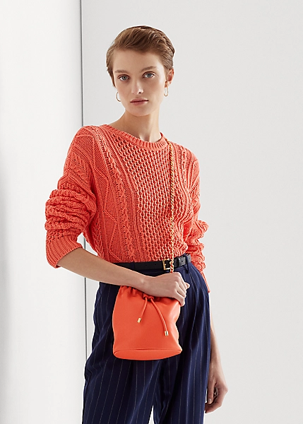 - Drawstring cinches on the front. Magnetic snapped closure. “Lauren Ralph Lauren”-debossed logo.