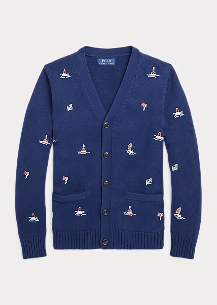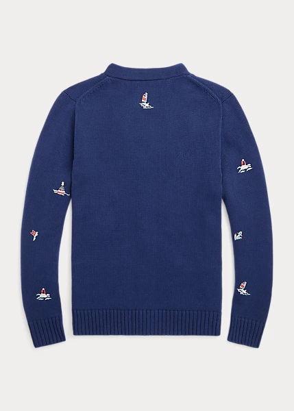 This cardigan is made with ultra-soft combed cotton and embroidered with a nautical motif of sailboats, anchors and buoys. Ralph Lauren partners with Better Cottonâ„¢ to improve cotton farming globally. Better Cotton trains farmers to use water efficiently, care for the health of the soil and natural habitats, reduce use of the most harmful chemicals and implement the principles of decent work.