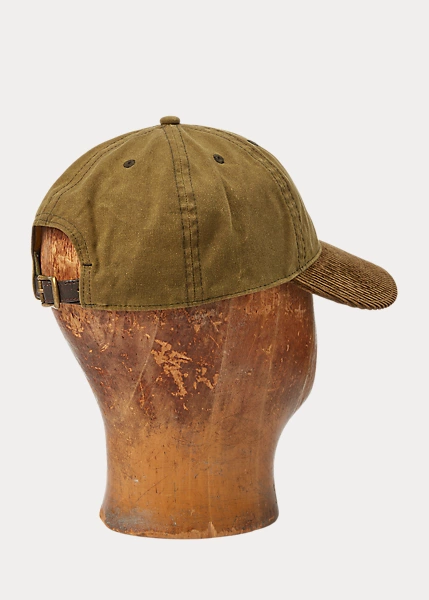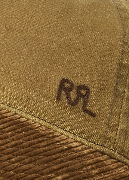 Oilcloth fabric sourced from a historic mill that specialises in waxed cottons. Corduroy top bill. Signature “RRL” logo embroidery on the front left panel. Leather strap on the back with an antiqued brass buckle. Signature green underbill.