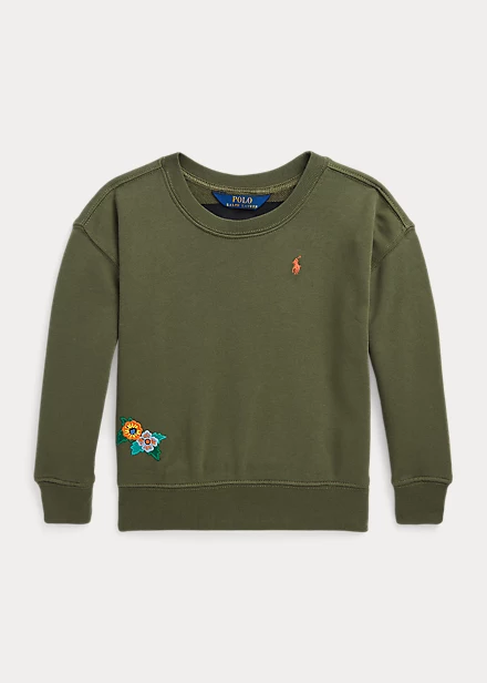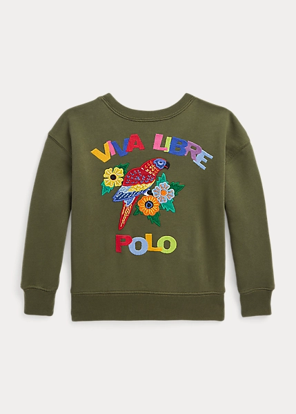 Washed for added softness, this cotton-blend layer features colourful appliqués spelling out “Polo” and “Viva Libre” alongside a parrot and tropical blooms.