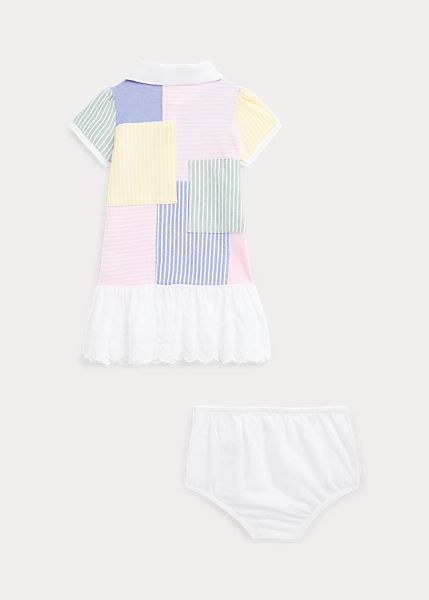 This Polo dress unites a playful patchwork design and an eyelet embroidered skirt. Ralph Lauren partners with Better Cottonâ„¢ to improve cotton farming globally. Better Cotton trains farmers to use water efficiently, care for the health of the soil and natural habitats, reduce use of the most harmful chemicals and implement the principles of decent work.