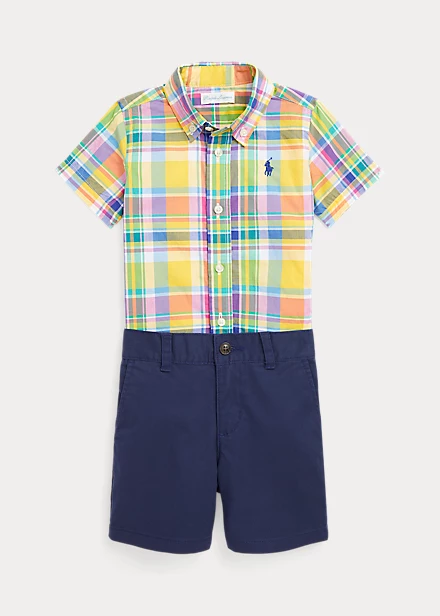 This warm-weather set pairs a plaid cotton shirt with versatile stretch chino shorts. Each piece is embroidered with our signature Pony and washed for added comfort. Ralph Lauren partners with Better Cottonâ„¢ to improve cotton farming globally. Better Cotton trains farmers to use water efficiently, care for the health of the soil and natural habitats, reduce use of the most harmful chemicals and implement the principles of decent work.