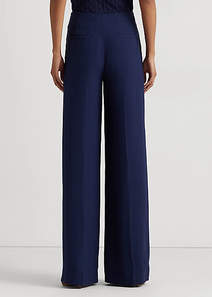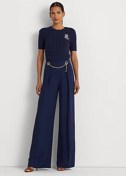 Rendered in double-faced georgette for a graceful drape and polished look, this stylish trouser is cut for a flattering high rise and a breezy wide-leg silhouette. Crisp pleats and a glistening chain self-belt on the waist enhance its elegant appeal.