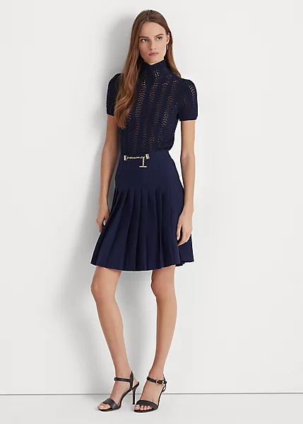 Embellished with an “LRL”-engraved chain on the front, this double-faced georgette skirt moves gracefully with each step thanks to its sunburst-pleated construction and A-line silhouette.