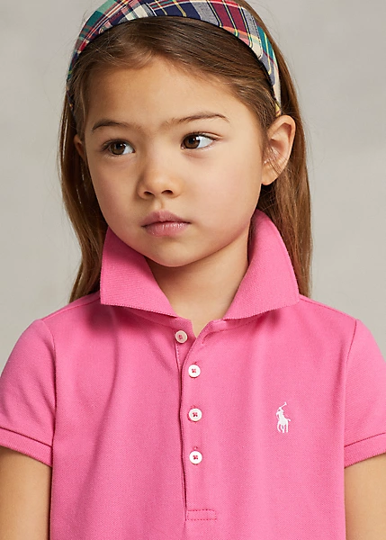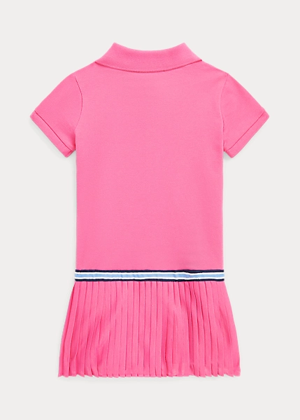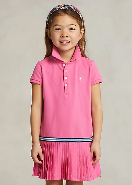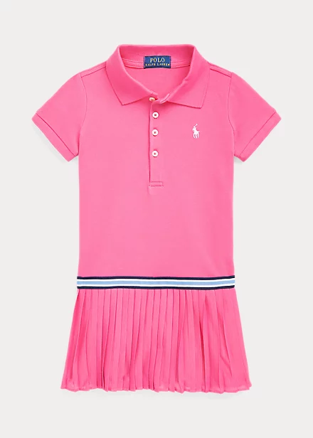 Grosgrain trim and a pleated skirt add cute sunny-day style to this stretch mesh Polo dress.