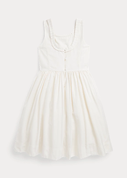 - Rounded neckline with pleated trim. Buttoned placket on the centre back.