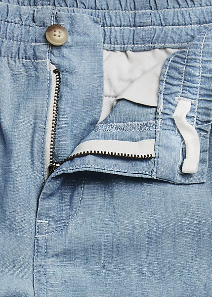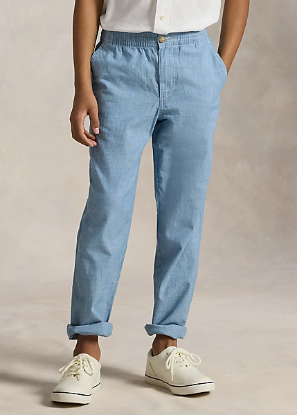 These trousers are made with washed cotton chambray and embroidered with our multicoloured signature Pony. Ralph Lauren partners with Better Cottonâ„¢ to improve cotton farming globally. Better Cotton trains farmers to use water efficiently, care for the health of the soil and natural habitats, reduce use of the most harmful chemicals and implement the principles of decent work.