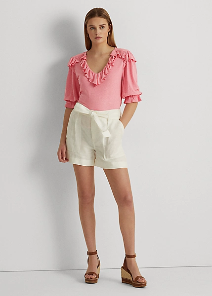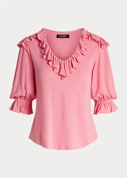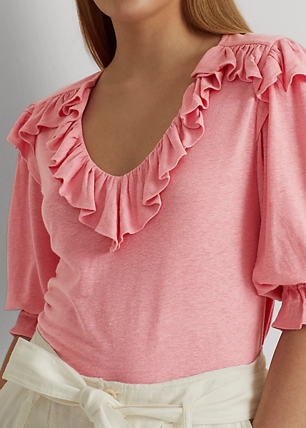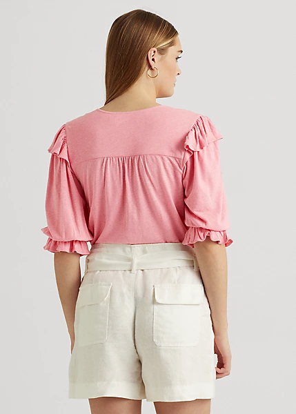 Blouson sleeves and ruffle trim define the feminine character of this relaxed-fitting top, which is made with lightweight linen-blend jersey for a soft hand.