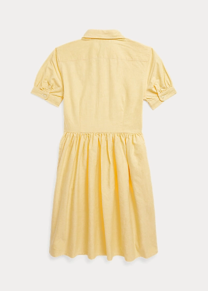 This cotton oxford shirtdress is washed for softness and detailed with pintucks and ruffle trim along the bodice. Ralph Lauren partners with Better Cottonâ„¢ to improve cotton farming globally. Better Cotton trains farmers to use water efficiently, care for the health of the soil and natural habitats, reduce use of the most harmful chemicals and implement the principles of decent work.