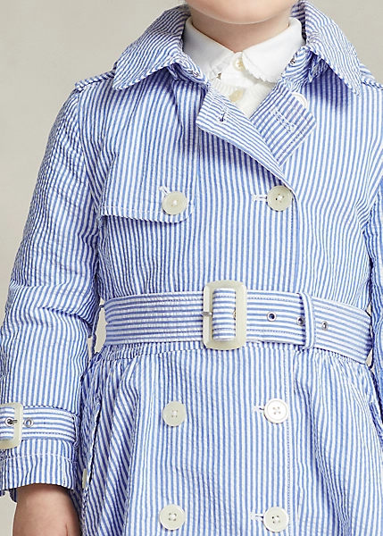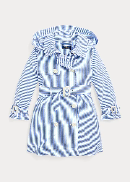 A cool-weather essential, our double-breasted trench coat is updated for the season with lightweight cotton seersucker and a removable hood. Ralph Lauren partners with Better Cottonâ„¢ to improve cotton farming globally. Better Cotton trains farmers to use water efficiently, care for the health of the soil and natural habitats, reduce use of the most harmful chemicals and implement the principles of decent work.