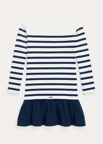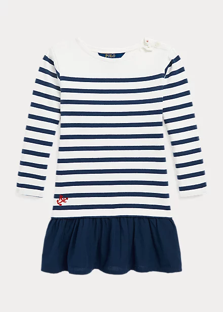 This dress captures the season’s nautical charm with a striped jersey bodice, a woven skirt and an embroidered anchor on the hem.