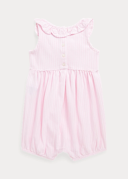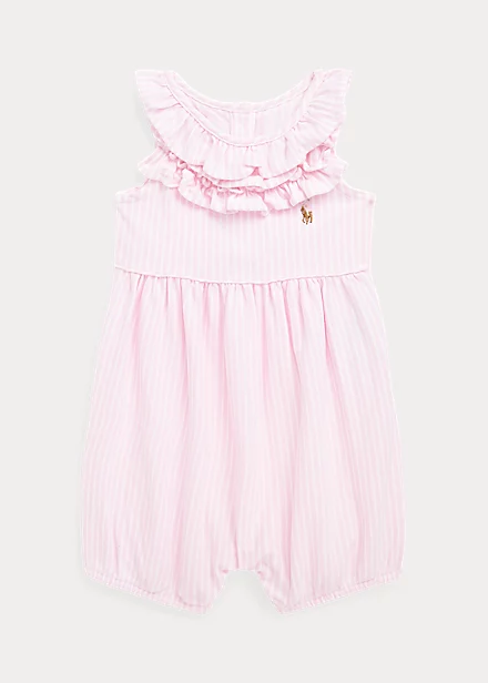 This one-piece is made with breathable cotton mesh and detailed with cute ruffle trim. Ralph Lauren partners with Better Cottonâ„¢ to improve cotton farming globally. Better Cotton trains farmers to use water efficiently, care for the health of the soil and natural habitats, reduce use of the most harmful chemicals and implement the principles of decent work.