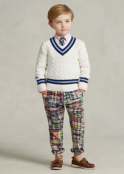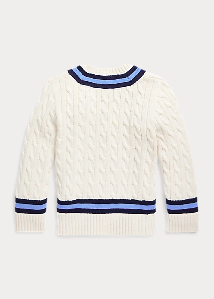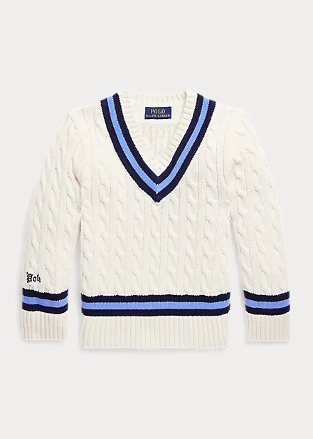 The cricket jumper is defined by its cable-knit pattern, usually in cream, as well as its V-neck and striped trim, which represents school or club colours. This version is made with soft cotton and features our logo embroidered above the right cuff. Ralph Lauren partners with Better Cottonâ„¢ to improve cotton farming globally. Better Cotton trains farmers to use water efficiently, care for the health of the soil and natural habitats, reduce use of the most harmful chemicals and implement the principles of decent work.